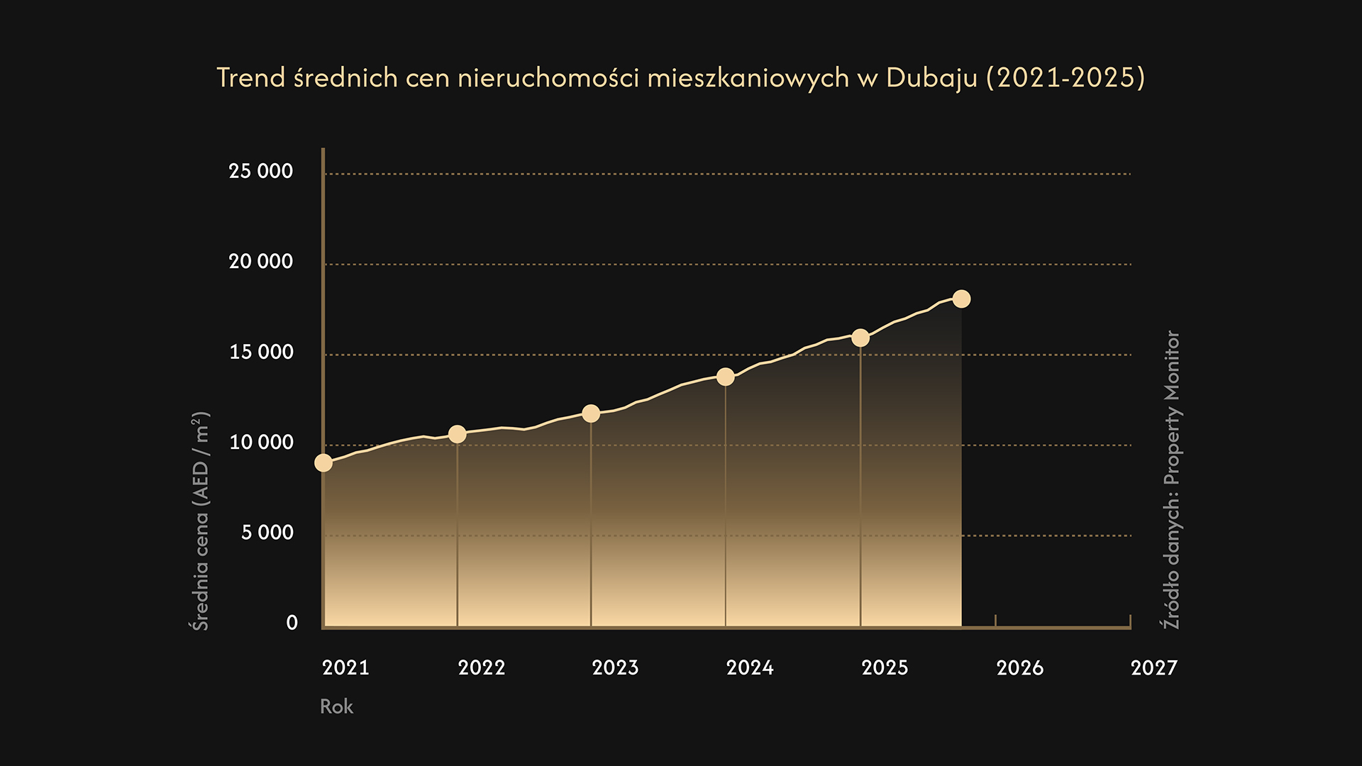 Ostatnie pięć lat przyniosło istotną zmianę obrazu rynku nieruchomości mieszkaniowych w Dubaju. Dane z lat 2021–2025 pokazują konsekwentny, długoterminowy trend wzrostowy, który nie był jedynie odbiciem po pandemii, lecz efektem głębszych, strukturalnych zmian w gospodarce miasta oraz w globalnych przepływach kapitału.
